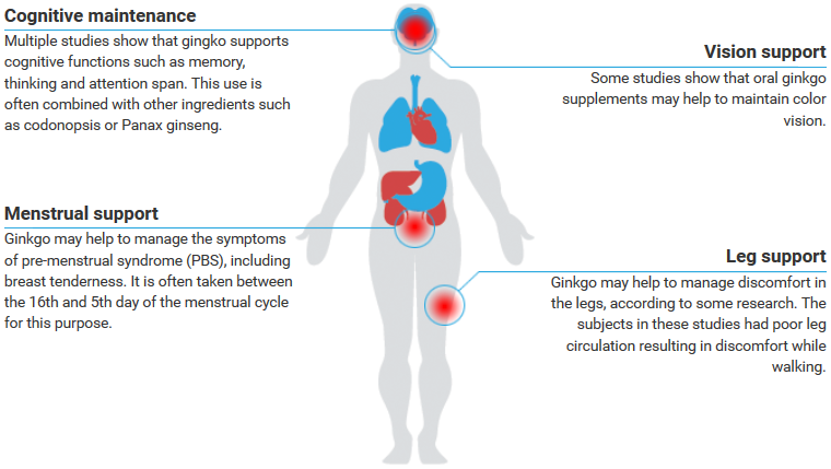 The most prominent use for gingko extract is for cognitive function. It may also support other functions such as vision, menstruation and walking.