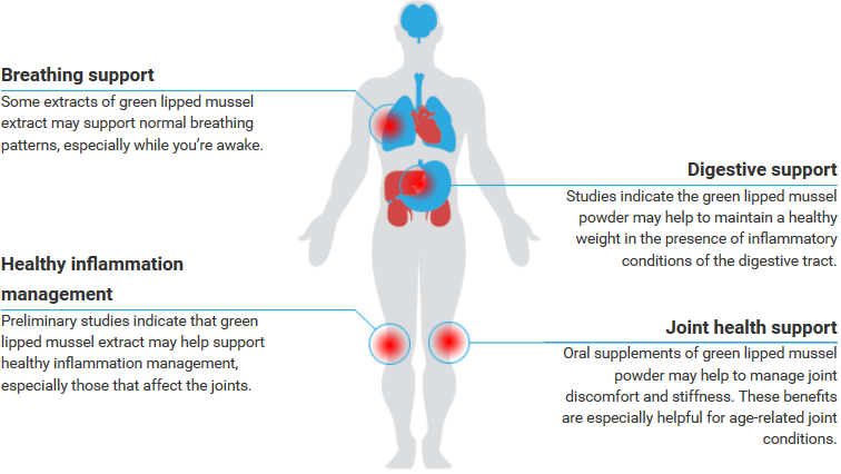 The primary health benefits of green lipped mussel derive from its properties that help support healthy inflammation management. These benefits include the support of joint function, breathing and digestion.