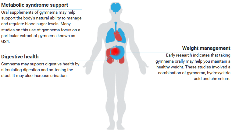 The most common use of gymnema today is to help support the body’s natural ability to manage and regulate blood sugar levels. Many people also take it for weight management, digestive health and other purposes.