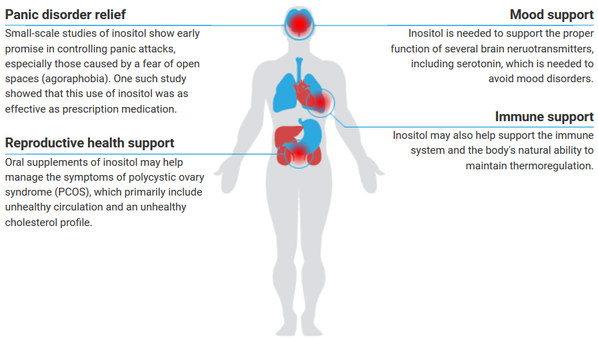 Relief from panic disorders is one of the common uses of inositol. It may also help with the symptoms of polycystic ovary syndrome (PCOS), which is a common condition among obese women. Additional problems that inositol may benefit include obsessive compulsive disorders (OCD).