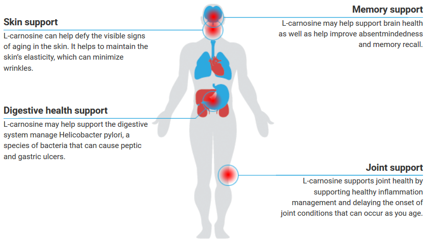 L-carnosine’s health benefits are generally due to its antioxidant properties, which support many age-related conditions. The specific uses of l-carnosine include support for the skin, joints, digestive system and memory.
